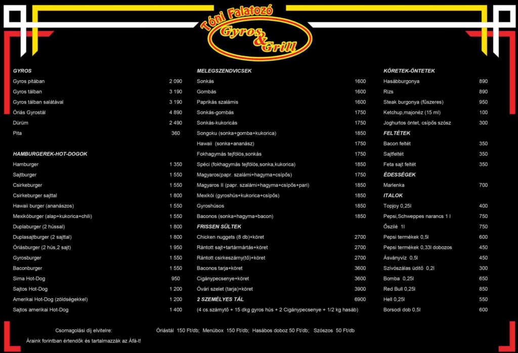 Rendelj tőlünk most>>> SteakburgonyaSonka-gombas-melegszendvicsSonka-ananaszSajtos-hot-dogSonka-kukoricaSonkas-melegszendvicsSajtburgerSajtos-amerikai-hot-dogRantott-sajtOrias-burgerOvari-szeletOrias-gyrostalMarlenkaNuggetsMagyaros-IIKukoricasMagyaros-IHasabburgonyaBaconosGyros-salataGyrostal-szosszalGyrostalCsibe-burgerGyros-husos-melegszendvicsHawaiiHot-dogGyros-pitabanCiganypecsenyeDurumGrill-tarjaFokhagymas-tejfolos-melegszendvicsBaconos-melegszendvicsAmerikai-hot-dogCsibe-burger-sajjtal